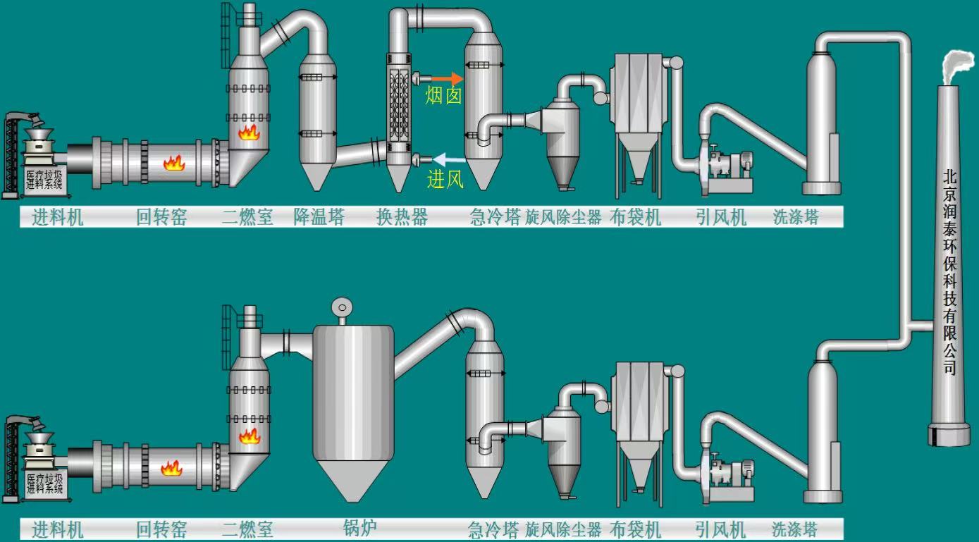 通過1100℃以上的回轉窯高溫焚燒,結合二燃室的二次燃燒,保證醫療廢物的徹底破壞。高溫煙氣采二流體急冷降溫,瞬間降至200℃以下,有效避免二噁英的再生產。煙氣除塵采用布袋除塵器并輔助活性炭加藥系統,有效捕集飛灰、重金屬、二噁英等有害物質。除塵后的煙氣經濕式脫酸塔液堿逆向脫酸后,通過煙囪排放。產生的廢水,經自建的污水處理廠處理達標后排放。